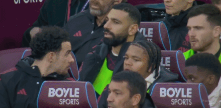 第50分钟,替补观战,镜头给到场边的萨拉赫